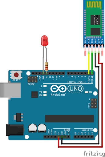 يعمل البلوتوث موديول بطريقة التواصل السريال (Serial Communication) , حيث يقوم برنامج الاندرويد (الموجود في اخر المقالة) بارسالة بيانات للبلوتوث موديول في حالة الضغط علي زرار معين , وفي الناحية الاخري عندما يستلم البلوتوث موديول اي بيانات من الجهاز المقترن به (الموبايل في هذه الحالة) , يقوم بارسال هذة البيانات الى لوحة الاردوينو عن طريق الـ Tx من الموديول (Rx في لوحة اردوينو).